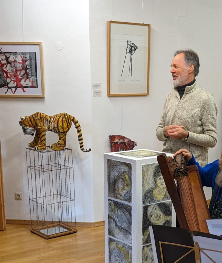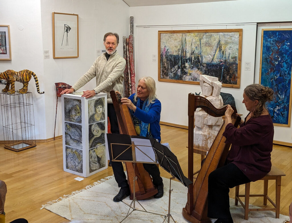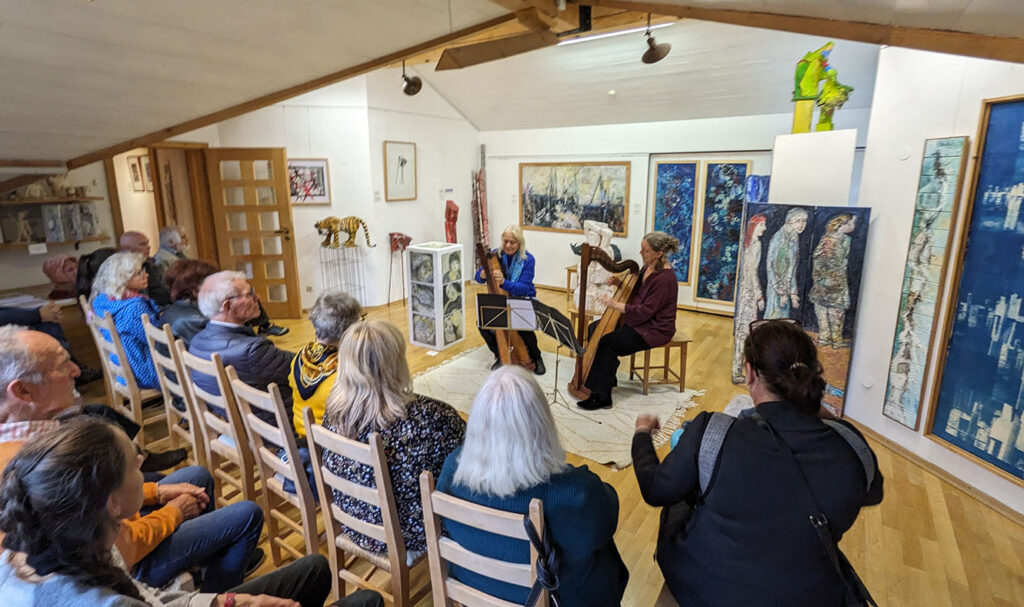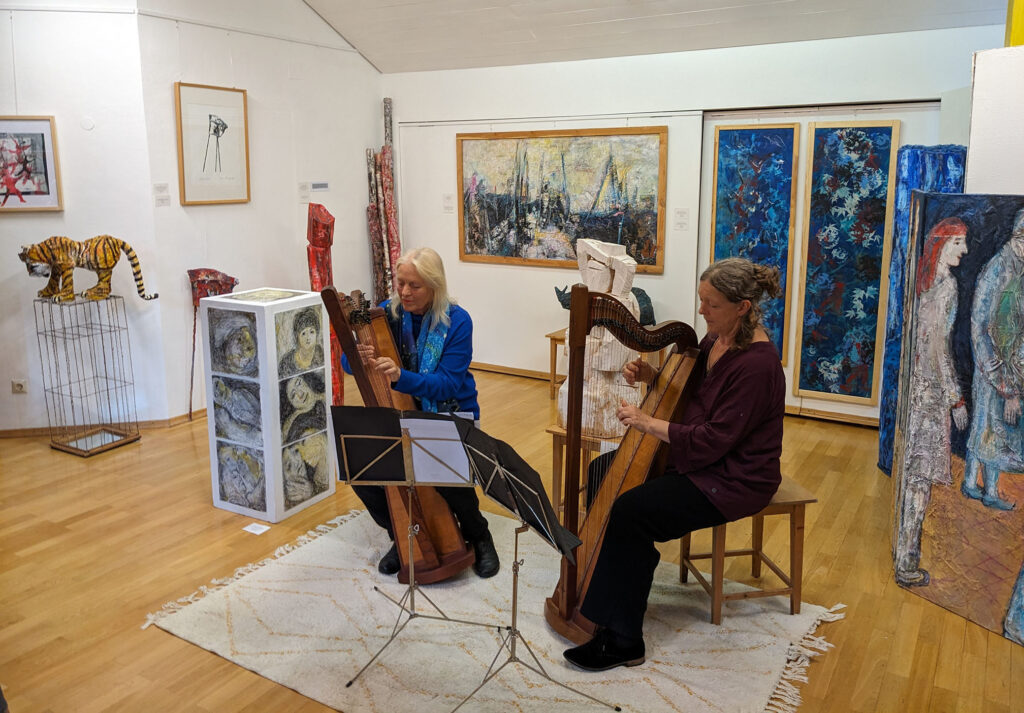 Die Ausstellung „Früher und heute und später“ am 27.9.2025 war mit ca. 50 Gästen gut besucht. Schwungvolle Harfenmusik von Eva Langenwalter und Felicitas Freuding umrahmte philosophischen Gedanken von Anton Freuding und eine heitere Kindheitserinnerung von Rosa-Maria Schwab, so dass Kunstwerke und Klang und Wort ein wunderbares Gesamtkunstwerk bildeten.